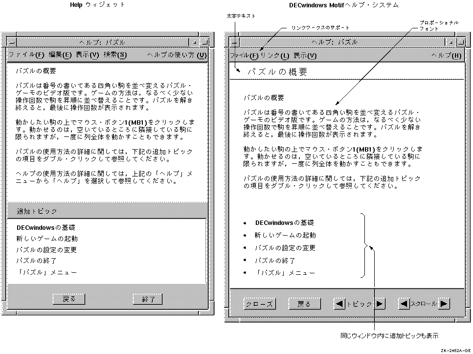 | 機能 | Helpウィジェット | DECwindows Motifヘルプ・システム |