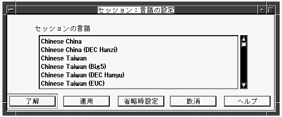 別のセッション言語を設定するには,セッション・マネージャの「オプション」メニューから「言語... 」を選択します。「言語の設定」ダイアログ・ ボックスが表示されます。図 3-4に「言語の設定」ダイアログ・ ボックスを示します。