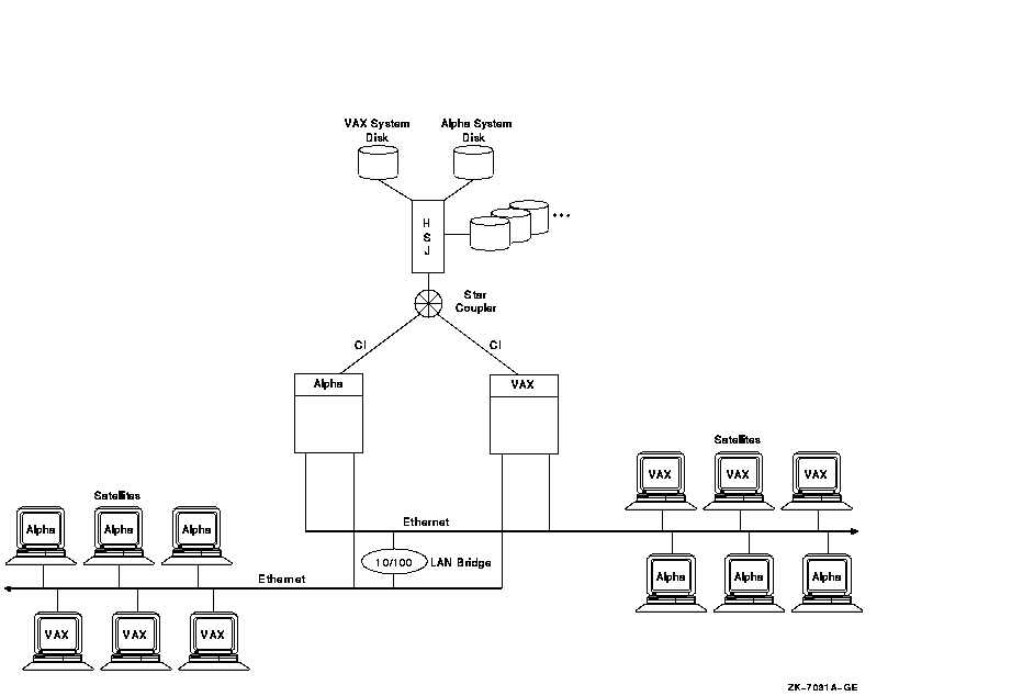 図 10_20 に示す OpenVMS Cluster を現在の制限以上に拡張する場合,この構成は 図 10-21 に示すような内容になります。