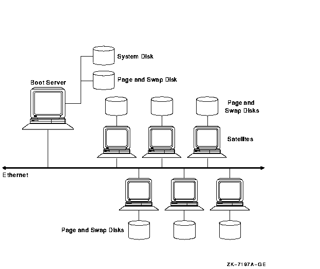 図 11-2 では,6 つのサテライトと 1 つのブート・サーバを Ethernet で接続しています。各サテライトには,専用のページ・ディスクとスワップ・ディスクがあり,これでシステム・ディスクの領域を節約するとともに, Ethernet からのページ・ファイルとスワップ・ファイルの I/O 処理を取り除きます。システム・ディスクからページ・ファイルとスワップ・ファイルを取り除いたことで, OpenVMS Cluster のパフォーマンスが強化できます。