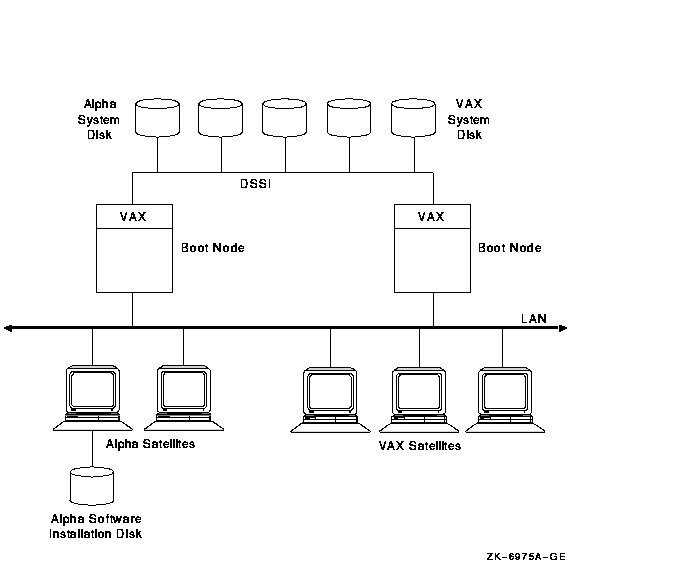 図 10-1 では,DSSI インターコネクトを使用する 2 台の VAX ブート・ノードと複数の VAX ワークステーションを含む既存の VAXcluster 構成に,複数の Alpha ワークステーションが追加されています。高い可用性を実現するために, Alpha システム・ディスクは複数のブート・サーバからアクセスできるように DSSI 上にあります。