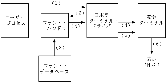 漢字ターミナルのフォントROM にない文字パターンを検知した場合,日本語ターミナル・ドライバが補助プロセスであるフォント・ハンドラに漢字コードを通知します。フォント・ハンドラは,システムのフォント・データベースを読み,その漢字コードの文字パターンを漢字ターミナルに送ります。
