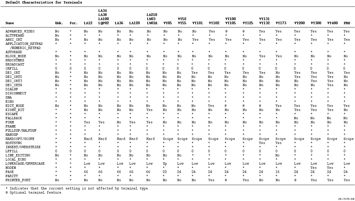 /ADVANCEDVIDEO /NOALTYPEAHD 1 /ANSI_CRT /NOAUTOBAUD /NOBLOCK_MODE /NOBRDCSTMBX /BROADCAST /CRFILL=0 /ECHO /NOEIGHT_BIT /NOESCAPE /NOFORM /FULLDUP /NOHOSTSYNC /LFFILL=0 /LOWERCASE /NODMA /PAGE=24 /NOPARITY /NOPASTHRU /NOREADSYN /SPEED=9600 /TAB /TTSYNC /TYPE_AHEAD /WIDTH=80 /WRAP