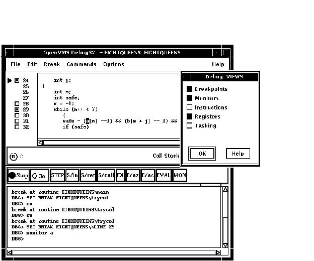 デバッグ・セッションの開始方法についての詳しい説明は,第9章を参照してください。 デバッガの使用方法について説明は, 第10章を参照してください。 本章のプログラムのソース・コードEIGHTQUEENS.EXEについては, 付録 Dを参照してください。