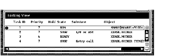 タスキング・ビューには,タスキング・プログラム(マルチスレッド・ プログラムとも呼ばれる)のすべてのタスクの現在の状態が表示されます。 タスクの実行,優先順位,状態変化などを制御するために,タスク特性を変更することができます。