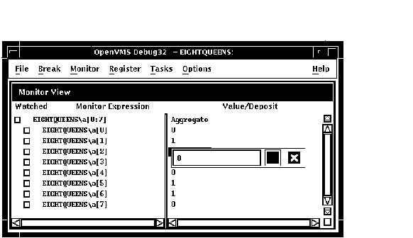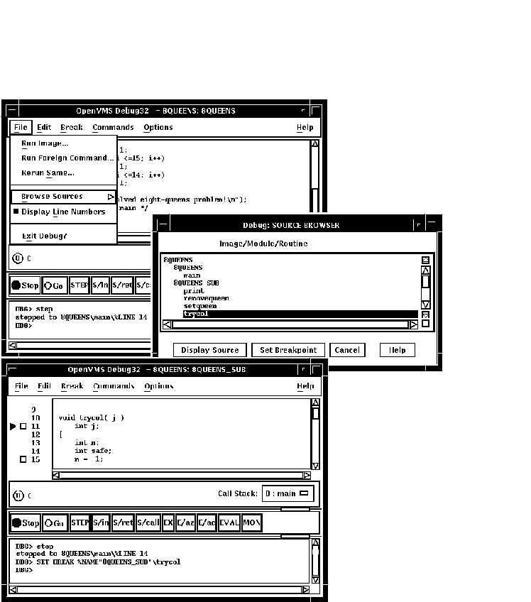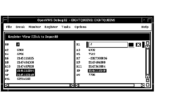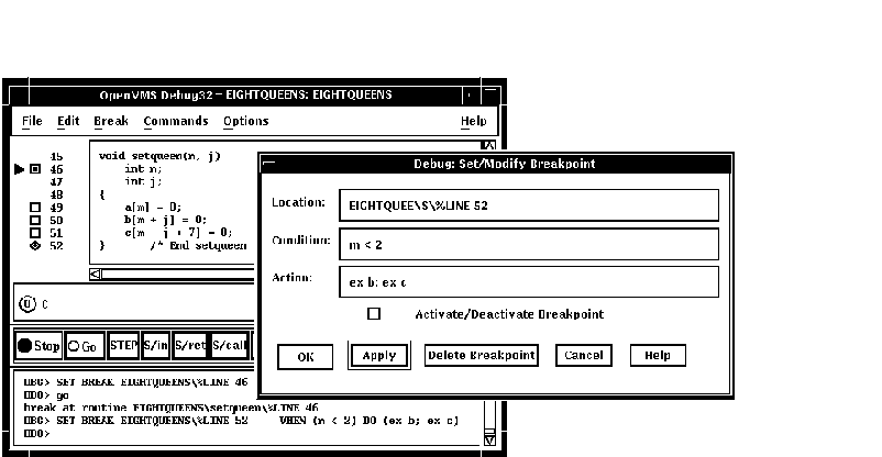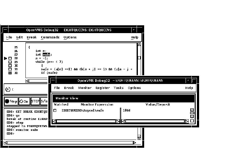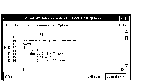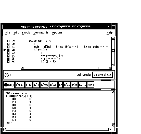 DECwindows Motifのコマンド・プロンプトにコマンドを入力することもできます。 デバッガ・コマンドの入力については,第8.3節を参照してください。 この章で紹介しているプログラムEIGHTQUEENS.EXE および8QUEENS.EXEのソース・コードについては, 付録 Dを参照してください。