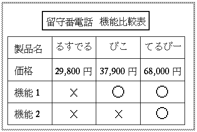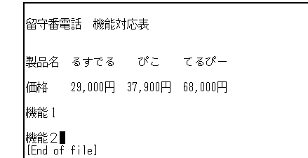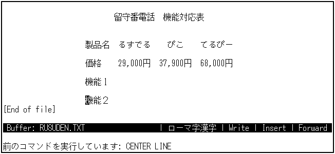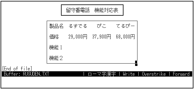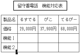 2行あけて,3行目にタイトルを入力します。2行あけるのは,後で箱を書くためです。 まず,"留守番電話"と入力し,2カラム移動して"機能比較表"と入力します。 確定したら,[Return]キーを3回押して,製品名の行との間に2行あけます。 2行あけるのは,後で箱を書くためです。