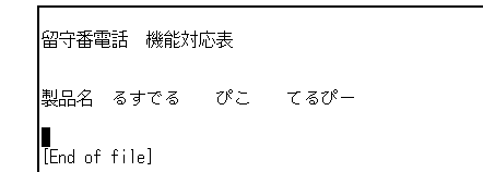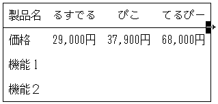 表の1行目には製品名が入ります。"製品名"と入力してから2カラム移動して, "るすでる",4カラム移動して"ぴこ",4カラム移動して"てるぴー"と入力します。 カラム数を空けて入力するのは,出来上がりをきれいにするためです。 確定したら,[Return] キーを2回押して1行あけます。1行あけるのは, 後で罫線を書くためです。