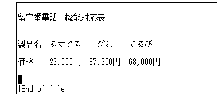 表の2行目には価格が入ります。 "価格"と入力してから,4カラム移動して"29,000円",2カラム移動して"37,900円", 2カラム移動して"68,000円"と入力します(このとき,数字は半角で入力してください)。 カラム数を空けて入力するのは,上段とそろえるためです。 確定したら,[Return]キーを2回押して1行あけます。