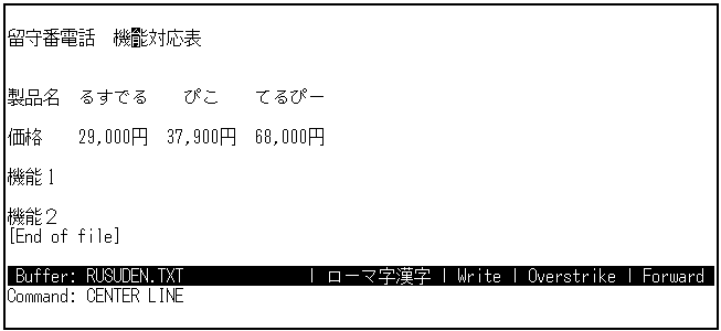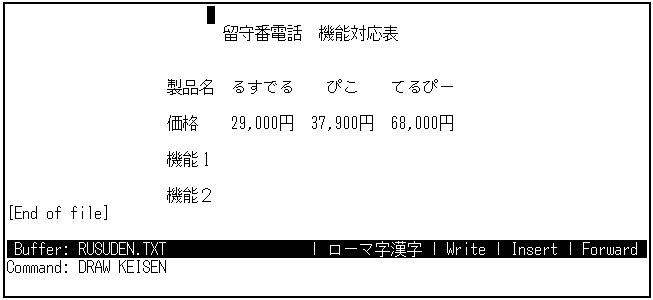 日本語EVEの DRAW KEISEN コマンドを実行し,箱モードを使用します。 さきほどセンタリングした"留守番電話 機能比較表"を, 太い枠の箱で囲んでみましょう。