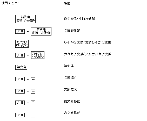 日本語処理ライブラリの漢字変換入力ルーチン (JLB$GET_COMMAND,JLB$GET_INPUT, JLB$GET_SCREEN) およびそれを使用している日本語ユーティリティ (KINQUIRE,JMAIL など) では変換キーを次のように割り当てています。