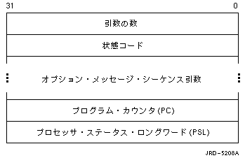 例外スタック・フレーム・アドレス Alphaシステムでは, この引数には例外スタック・フレームのアドレスが格納される (VAXシステムのメカニズム・アレイにはこれに対応する引数はない)。