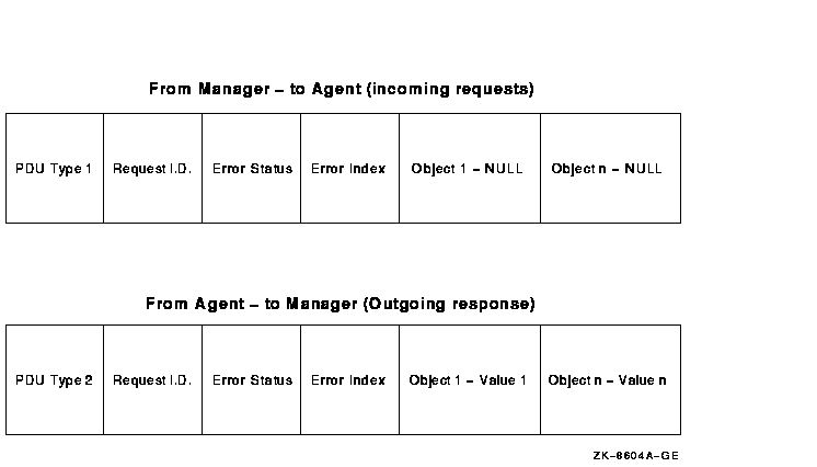 The eSNMP Get command initiates a network management query to a remote agent which returns a response. This command attempts to retrieve the items of management information. Figure 2-1 shows the PDU format for the Get command.
