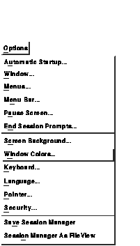 Session Manager's Options menu includes menu items for customizing session features such as your keyboard, language, window colors, and security settings.