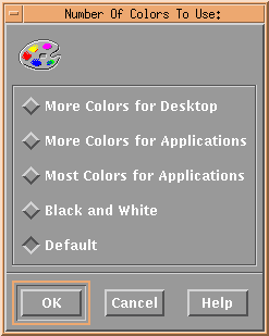If an application exhibits any of these symptoms, use the Number of Colors... dialog, shown in Figure 3-3, to give as many colors as possible to the application. The number of color sets used by the desktop depends on the selection in the Number of Colors... dialog. The fewer color sets used for the desktop, the more colors available for an application. The Number of Colors options are described in Table 3-6. Figures 3-3 Number of Colors Menu