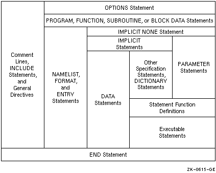 Figure 1-1 shows the required order of statements in a Fortran program unit. In this figure, vertical lines separate statement types that can be interspersed. For example, you can intersperse DATA statements with executable statements.