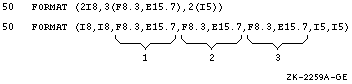 Similarly, you can apply a group of field descriptors repeatedly to data fields by enclosing these field descriptors in parentheses and preceding them with an unsigned integer constant (PARAMETER constants are not allowed). The integer constant is called a group repeat count.