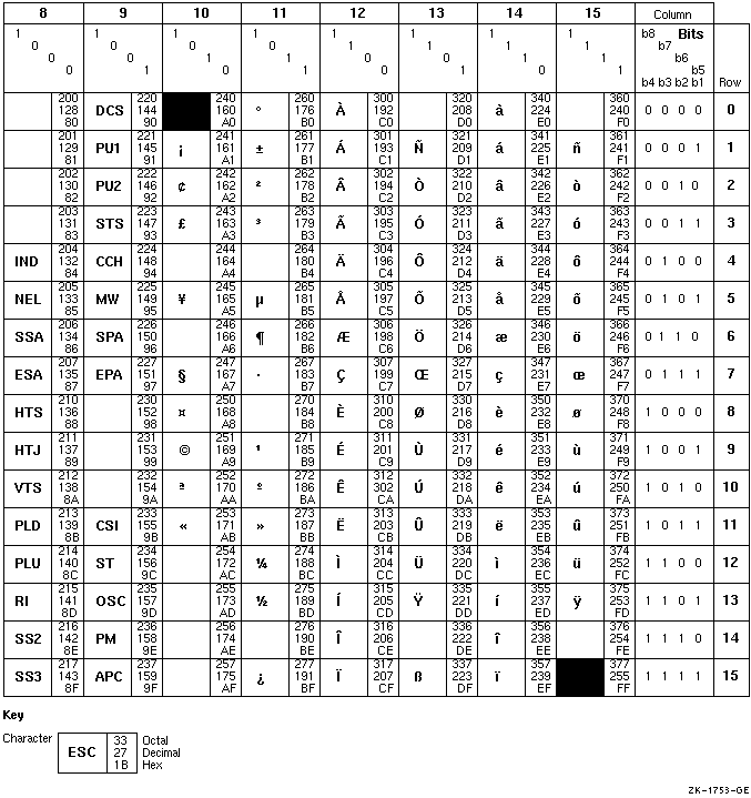 The ASCII character set comprises the first half of the DEC Multinational Character Set. Figure B-2 represents the second half of the DEC Multinational Character Set (characters with decimal values 128 through 255). The first half of each of the numbered columns identifies the character as you would see it on a terminal or printer (these characters cannot be output on some older terminals and printers). The characters with names are nonprintable. In Figure B-2, the characters with names are defined as follows: