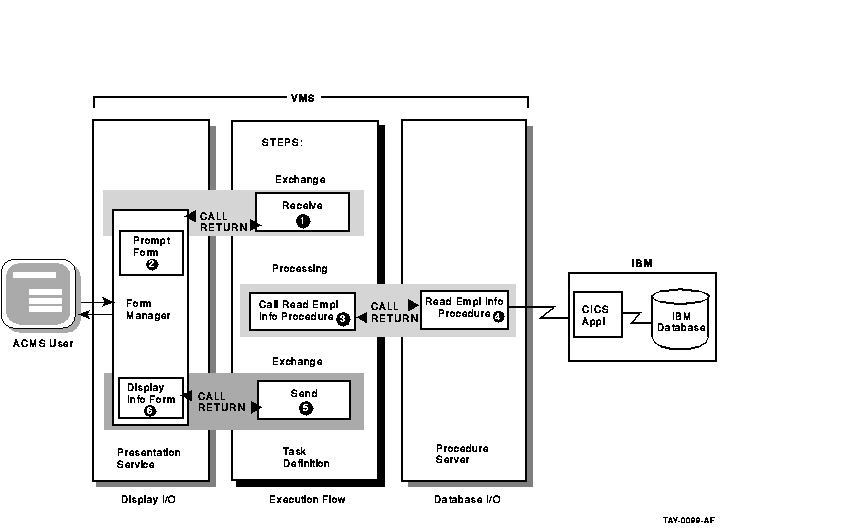 | [TSK5] | Calls the COBOL procedure READ_EMPL_INFO within a PROCESSING step. The COBOL procedure performs the database inquiry and returns the employee record to the ACMS application using the EMPLOYEE_INFO_WKSP workspace. |