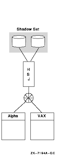 Figure 10-5 shows two nodes connected to an HSJ, with a two-member shadow set.