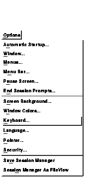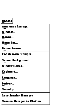 You can change Session Manager's icon name and window name as well as its startup state. To change your Session Manager window, choose Window... from Session Manager's Options menu. Session Manager displays a Window dialog box.