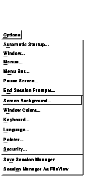 To change your screen background, choose Screen Background... from Session Manager's Options menu. Session Manager displays the Screen Background Options dialog box.