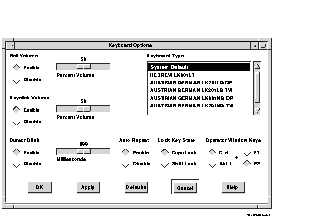 To use this new keyboard type for subsequent sessions, you must save the new setting before you end the current session. The new keyboard type is in effect for your sessions only after DECwindows verifies your password at the start of each new session.