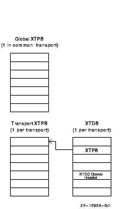 The transport-common code creates the global XTPB structure at initialization time. The transport-common DECW$XPORT_ATTACH_TRANSPORT routine creates XTDB and XTPB data structures, as shown in Figure 3-5. The XTCC, XTCQ, and XTCB data structures are allocated from memory pages that are user-writable so that routines running in either user or executive mode can modify them.
