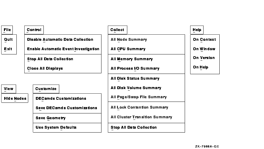 To obtain help about DECamds, choose a menu item from the Help menu.