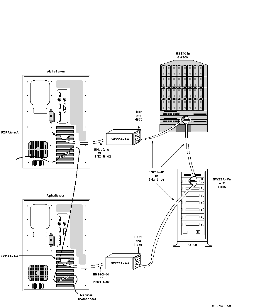 Figure A-4 shows a logical representation of a basic configuration using SCSI adapters and a StorageWorks enclosure. This configuration has the advantage of being relatively simple, while still allowing the use of tapes, floppies, CD-ROMs, and disks with nonshared files (for example, page files and swap files) on internal buses. Figure A-5 shows this type of configuration using AlphaServer 1000 systems and a BA350 enclosure. The BA350 enclosure uses 0.9 m of SCSI cabling, and this configuration typically uses two 1-m SCSI cables. (A BA353 enclosure also uses 0.9 m, with the same total cable length.) The resulting total cable length of 2.9 m allows fast SCSI mode operation. Although the shared BA350 storage enclosure is theoretically a single point of failure, this basic system is a very reliable SCSI OpenVMS Cluster configuration. When the quorum disk is located in the BA350, you can shut down either of the AlphaStation systems independently while retaining access to the OpenVMS Cluster system. However, you cannot physically remove the AlphaStation system, because that would leave an unterminated SCSI bus. If you need the ability to remove a system while your OpenVMS Cluster system remains operational, build your system using DWZZx converters, as described in Section A.5.1.2. If you need continuous access to data if a SCSI interconnect fails, you should do both of the following: