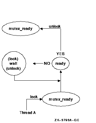 It is important to wait on the condition variable and evaluate the predicate in a while loop. This ensures that the program checks the predicate after it returns from the condition wait. For example, a thread A may need to wait for a thread B to finish a task X before thread A proceeds to execute a task Y. Thread B can tell thread A that it has finished task X by putting a TRUE or FALSE value in a shared variable (the predicate). When thread A is ready to execute task Y, it looks at the shared variable to see if thread B is finished (see Figure 2-5). Figure 2-5 Thread A Waits on Condition Ready