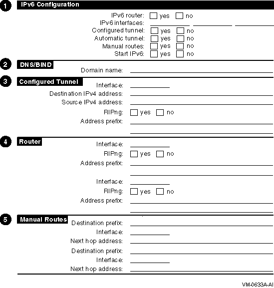 In a simple host-to-host configuration (shown in Figure 1-10), host A and host B use IPv6 link-local addresses. By default, the TCPIP$IP6_SETUP command configures the hosts automatically with a link-local address for your system. Figure 2-2 shows the completed worksheet for host A.