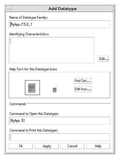 - Optional: If the application supplies a print command for printing data files from the command line, type the command into the Command to Print this Datatype text field, using the syntax $n for a file argument.