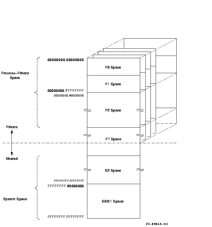 The P0 and P1 spaces are defined to equate to the P0 and P1 regions defined by the VAX architecture. Together, they encompass the traditional 32-bit process-private region that ranges from 0.0000000016 to 0.7FFFFFFF16. P2 space encompasses all remaining process space that begins just above P1 space, 0.8000000016, and ends just below the lowest address of PT space.