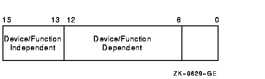 I/O functions are described by 16-bit, symbolically expressed values that specify the particular I/O operation to be performed and any optional function modifiers. Figure 23-5 shows the format of the 16-bit function value. Symbolic names for I/O function codes are defined by the $IODEF macro. Figure 23-5 I/O Function Format