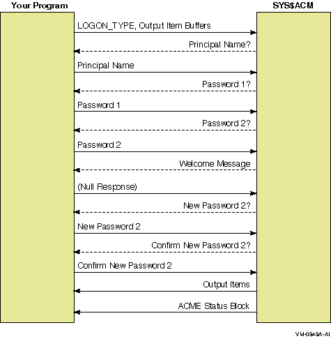 Your ACM client program can call the SYS$ACM[W] system service to change a password, and the effect is the same as if SET PASSWORD had made the call. Your ACM client program can call the SYS$ACM[W] system service to authenticate a user. Your authentication is audited and break-in evasion is checked in the ACME server process, just as for LOGINOUT.