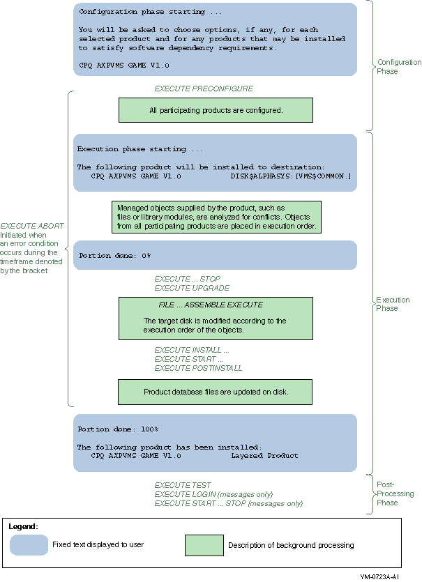 These diagrams illustrate the processing of EXECUTE statements in relation to events that occur during the major phases of an operation. Shaded boxes show typical output from these commands to help establish the timeline of events. The installation and reconfiguration operations are performed in three phases: