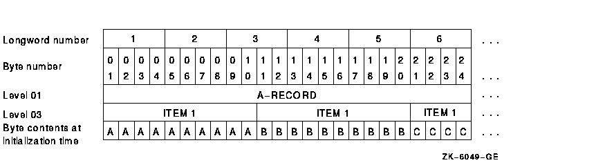 Often a table is too long to initialize using a single literal, or it contains numeric, alphanumeric, COMP, COMP-1, COMP-2, or COMP SYNC items that cannot be initialized. In these situations, you can initialize individual items by redefining the group level that precedes the level containing the OCCURS clause. Consider the sample table descriptions illustrated in Example 4-13 and Example 4-14. Each fill byte between ITEM1 and ITEM2 in Example 4-13 is initialized to X. Figure 4-11 shows how this is mapped into memory.