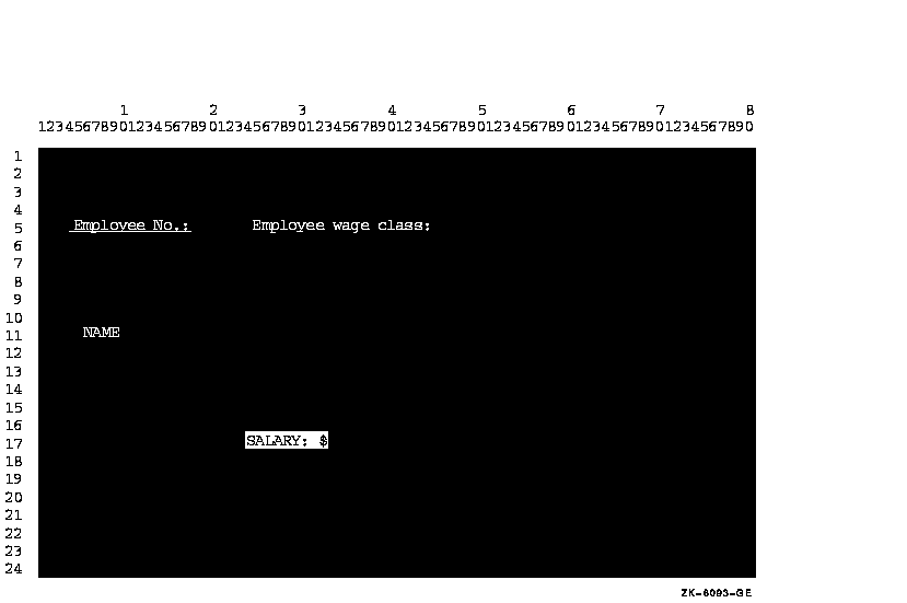 DISPLAY "Employee No:" UNDERLINED LINE 5 COLUMN 5 ERASE SCREEN.