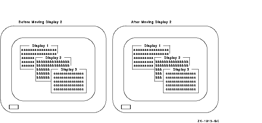 The video and display attributes you specify when you create a virtual display can be changed. The SMG$CHANGE_RENDITION routine lets you change video attributes while the SMG$CHANGE_VIRTUAL_DISPLAY routine lets you change both video and display attributes. For example, you can redimension a virtual display with the latter routine. When you redimension a virtual display, the data in it is copied to the redimensioned display; that is, as much of the current contents (starting with row 1, column 1) as will fit in the newly dimensioned display are preserved.