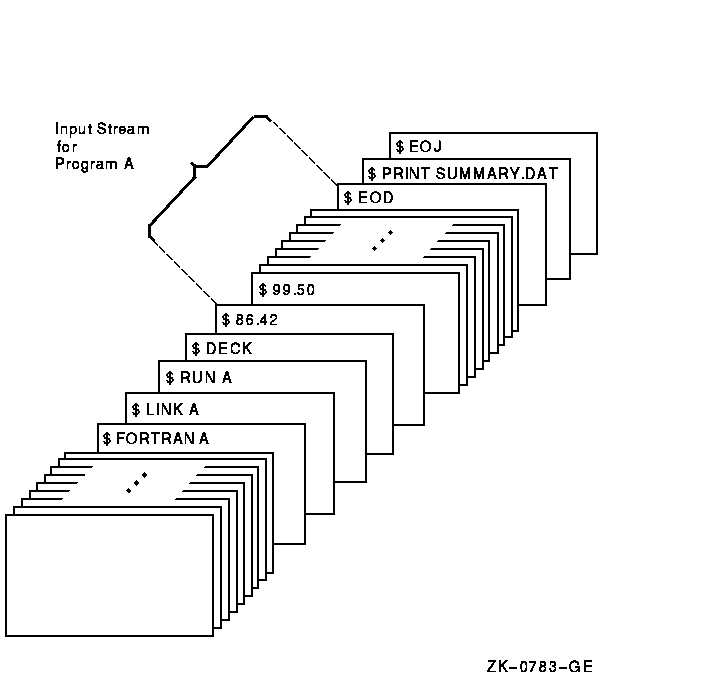 In this example, the Fortran and LINK commands compile and link program A. When the program is run, any data the program reads from the logical device SYS$INPUT is read from the command stream. The DECK command indicates that the input stream can contain dollar signs in column 1 of the record. The EOD command signals end-of-file (EOF) for the data.
