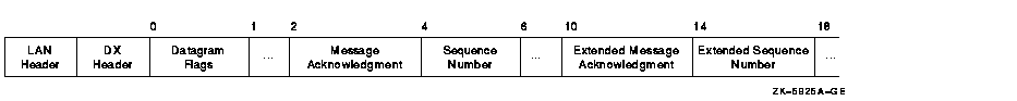 F.8.4 Datagram Exchange (DX) HeaderThe datagram exchange (DX) header for the OpenVMS Cluster protocol is used to address the data to the correct OpenVMS Cluster node. The DX header, shown in Figure F-8 and described in Table F-9, is 14 bytes long. It contains information that describes the OpenVMS Cluster connection between two nodes. See Section F.10.3 about methods of isolating data for the DX header. Figure F-8 DX Header