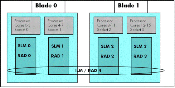 Figure 1 illustrates an i2 server (BL870c i2) configuration having two blades (blade 0 and blade 1). Each blade contains two quad-core sockets with their socket local memory. Memory access for socket 0 from SLM0 is faster when compared to access from SLM1, even though both the sockets are in the same blade. Similarly, memory access latency across the blades is costlier. Figure