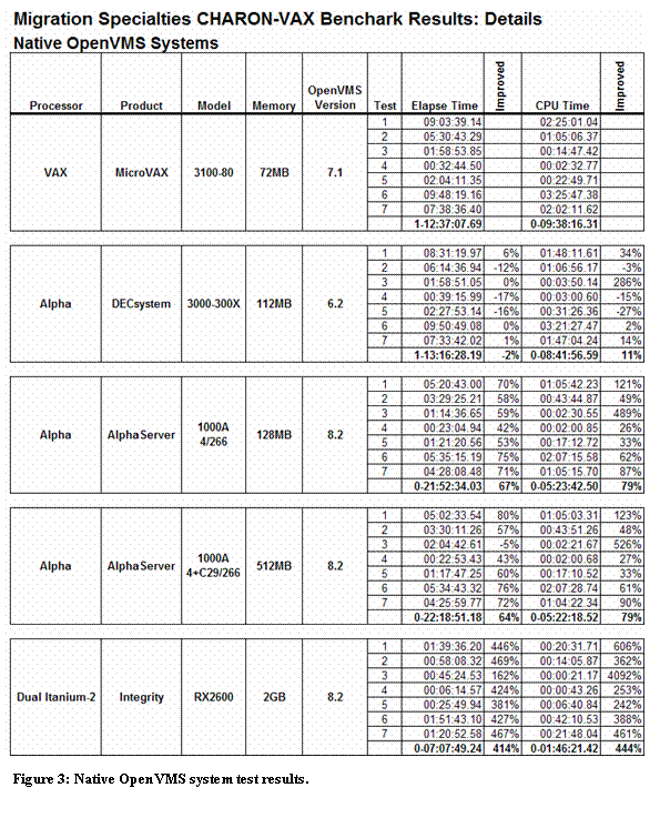 two tables summarize the results. Each table leads off with the native OpenVMS