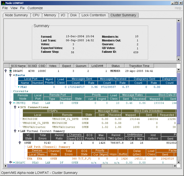 The Cluster Summary page contains cluster interconnect information for an entire cluster as well as detailed information about each node in the cluster, including System Communications Services (SCS) circuits and connections for individual nodes.