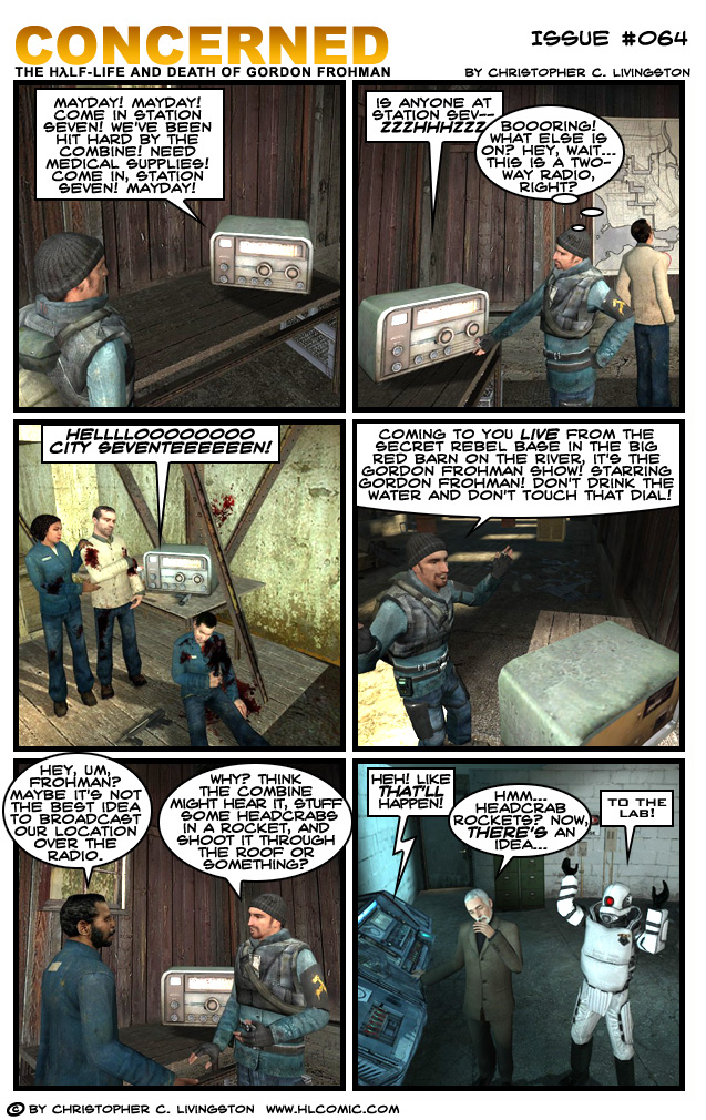 People write to me sometimes, asking for pointers on making comics. I'm never really sure how to answer, me being new at this whole comics thing and them being sort of vague about what sort of pointers they're after. After the time spent making today's comic, I can offer the following pointers, however: If you're going to do a G-Mod comic, particularly a comic that uses locations from three different maps, be really, really careful when you're snapping screenshots for it. If, for example, you forget to take a picture of a guy fiddling with the knobs of the radio and instead just have him standing in front of it, apparently moving the knobs with his MIND, you'll need to take the time to go back into the game and repose him. Not a huge deal to go back in and move his arm, unless, you know, you neglected to save the game, in which case you'll have to start from scratch. If you, just hypothetically now, don't want the bright green static camera directly in the middle of the shot in the first panel (which you stupidly left there while shooting the fourth panel), you may want to remove it before you take your pictures. Again, save your game. Especially since you didn't save it the first time. Finally, think about your last panel before you rush in and pose a couple metrocops for it. Maybe you want Dr. Breen in there with a Combine Elite instead. Maybe if you'd thought of that first, you wouldn't have to go back into the game for the 700th time that evening. And even if you decide to stick with the metrocops because you're too damn tired to bother with doing it over, make sure they're actually on the correct side of the console for the dialogue to work properly. Unlike the dope who staged this shot.