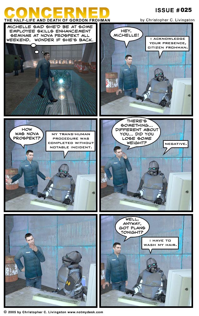 In the game, these Combine soldiers are apparently humans who have been surgically altered in a facility known as Nova Prospekt. Posing Notes: Once again, the word bubble in Panel 1 is covering about 900 zillion more barrels on a walkway. I blew this scene up when I was done with it. |