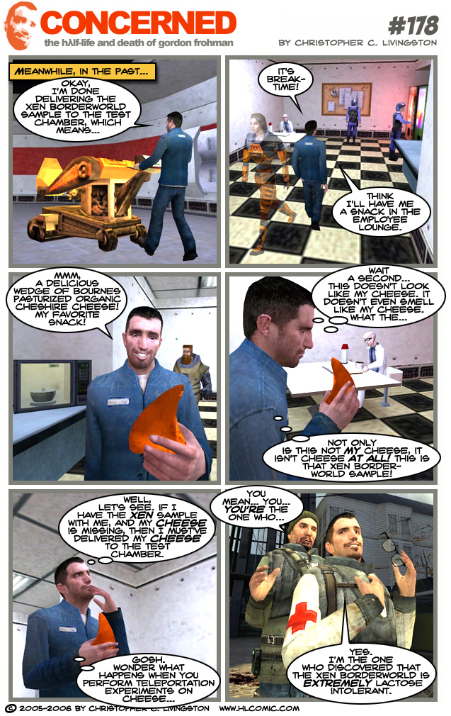 There's some cool stuff in the HL:Source mod I used for this comic, like the female training/tutorial hologram (I made her semi-transparent in Photoshop for panel 2) and Ivan the Space Biker (the original concept for Gordon Freeman's appearance) you can see in panel 3. The Bournes Pasturized Organic Cheshire Cheese line something you might get if you know the Concerned forums fairly intimately. See, forum goons, I'm not just making this up as I go. I plan ahead. I plan way, way ahead. Frohman is actually holding a clavicle bone, painted orange in G-Mod. Which is pretty ghastly, really, but it's the most cheese-shaped thing I could find in the prop-list.