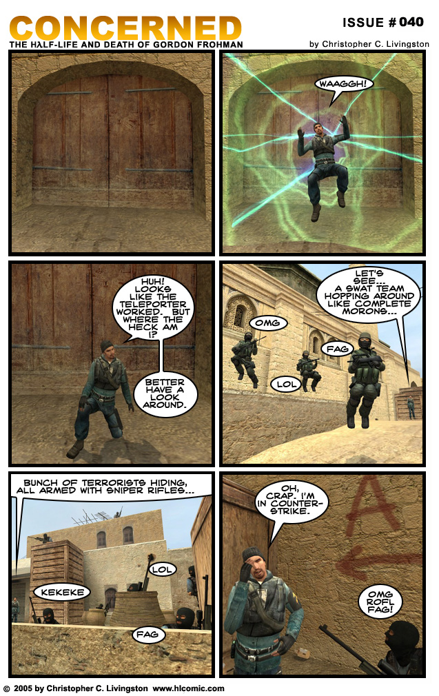 Okay! Counter-Strike, if you're not a gamer, is an immensely popular multiplayer modification to Half-Life and Half-Life 2. Two teams, terrorists and counter-terrorists, face off on a map, their goals being to either kill all the members of the opposing team or prevent them from completing their objectives, which vary depending on which map is being played. It's an incredibly fun game, highly addictive, and the most popular first-person shooter in history (according to Wikipedia, Counter-Strike servers produce more internet traffic than the entire country of Italy). Of course, it's not without its problems. The CS community has a reputation for being a bit... juvenile. There's also a lot of hopping around, mainly to throw off the aim of the inevitable crowd of unmoving snipers. Posing Notes: I'm not great with Photoshop, so it's nice that Garry's Mod includes a number of effects you can add right there in the game, as seen in Panel 2.