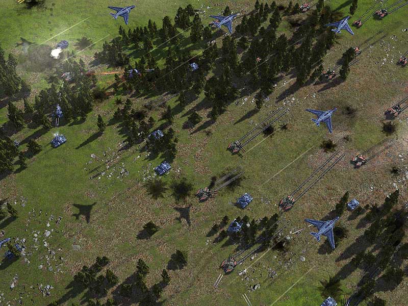 Description: An overhead shot, showing UEF fighters flying above an engagement between UEF bots and Cybran tanks.